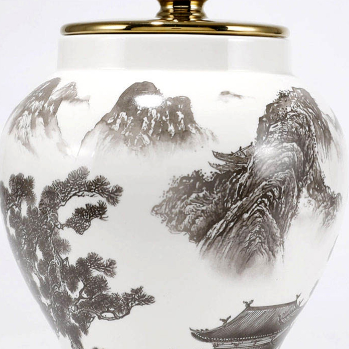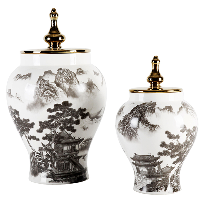 This porcelain jar is in traditional Chinese style. The surface of the vase is painted with Chinese paintings, and the gilded lid adds to the luxurious effect. It combines Chinese style and modern design trends perfectly. This porcelain jar is designed for everyday use.
