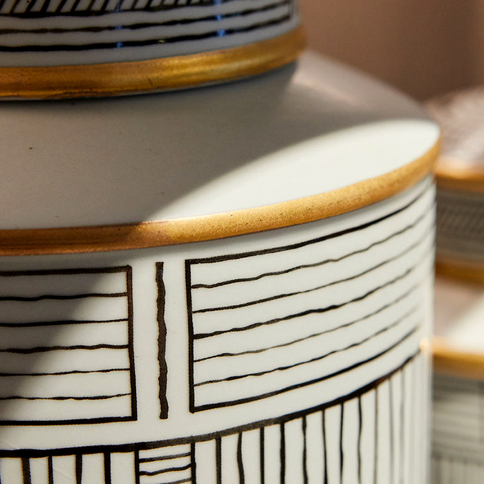 The pattern of this jar is composed of simple lines and the outline of fake gold is used around it to make the whole pot look more luxurious. This t is designed for everyday use.
